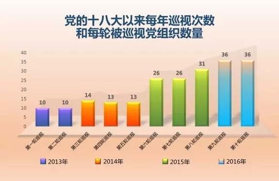 2013年,2輪中央巡視20個(gè)巡視對(duì)象;2014年,3輪巡視40個(gè)巡視對(duì)象;2015年,3輪巡視83個(gè)巡視對(duì)象;2016年,僅前2輪巡視已經(jīng)覆蓋64個(gè)巡視對(duì)象,同時(shí)對(duì)巡視過的8個(gè)省市進(jìn)行“回頭看”。中央巡視利劍頻頻出鞘,節(jié)奏明顯加快。