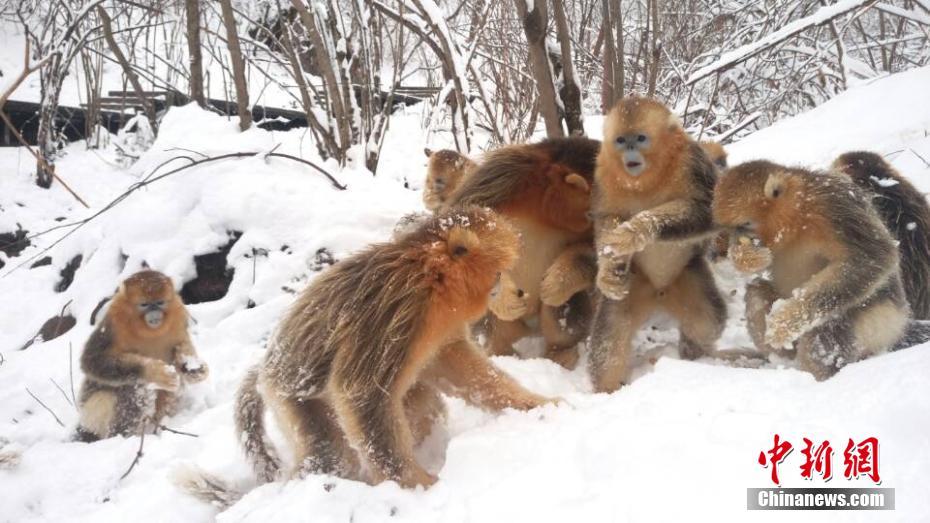 11月8日,湖北神農(nóng)架林區(qū)高山地帶降下入冬以來最大一場雪,樂壞了金絲猴,它們在雪地樹叢間嬉戲打鬧,還打起了雪仗。黃天鵬 攝