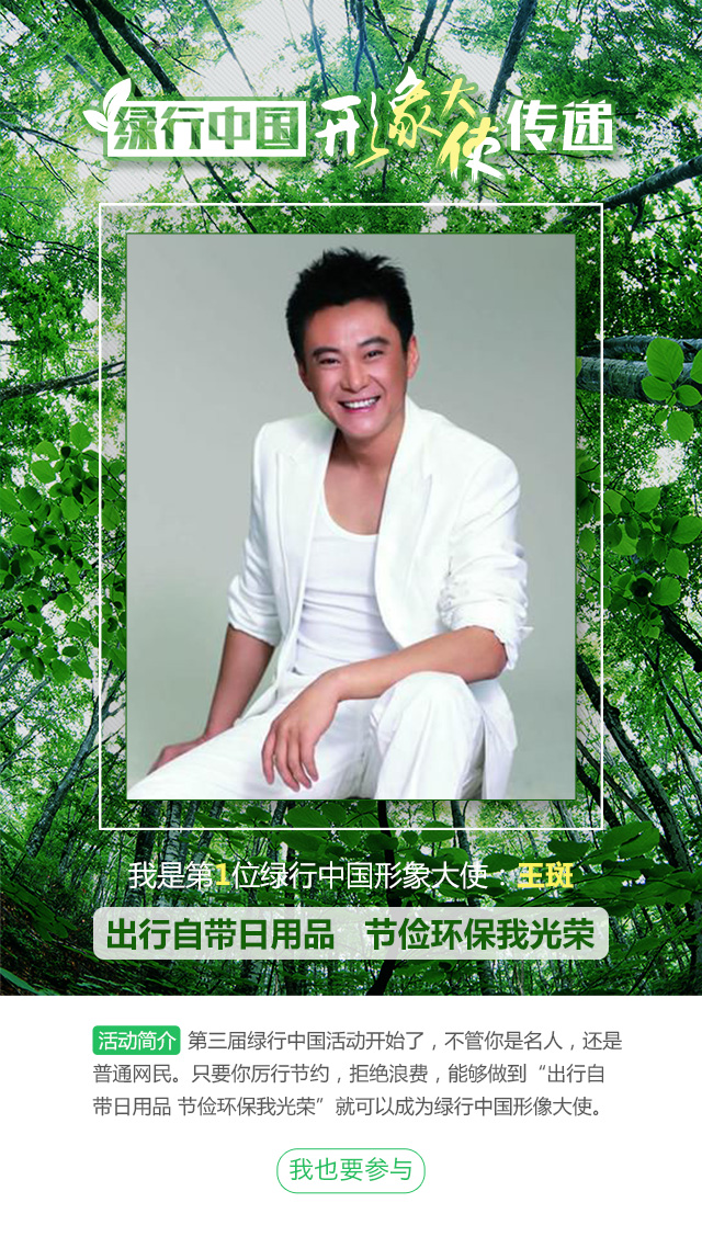 而作為本屆活動(dòng)的最大亮點(diǎn),綠行中國首次聘請(qǐng)國家一級(jí)演員王斑擔(dān)任形象大使,發(fā)揮了名人效應(yīng),讓綠色環(huán)保家喻戶曉。王斑與妻子曹穎都通過微博轉(zhuǎn)發(fā)了綠行中國的活動(dòng)報(bào)道,并呼吁:讓我們從小事做起,從自我做起,“綠行中國”功在當(dāng)下,利在千秋,出行自帶日用品,節(jié)儉環(huán)保我光榮。煙臺(tái)最美女孩刁娜也參與其中,在微信中呼吁踐行綠色環(huán)保。在他們的號(hào)召和帶動(dòng)下,近200名網(wǎng)友紛紛參與,爭當(dāng)形象大使,厲行節(jié)約,拒絕浪費(fèi)。