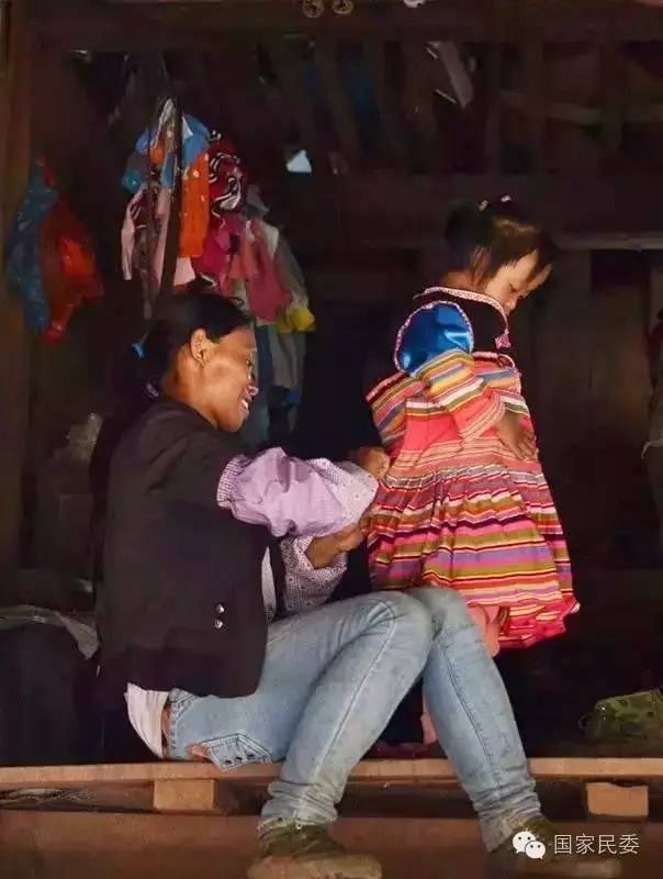 一位基諾族婦女在給女兒穿新衣服。
