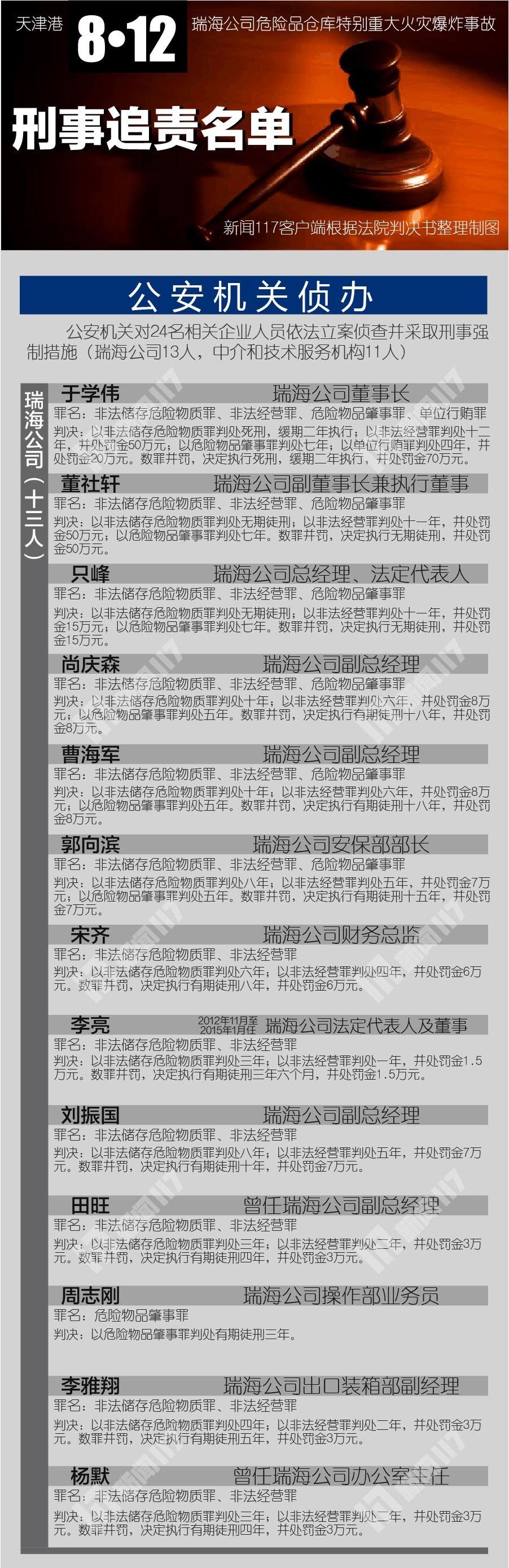 法庭宣判,天津東疆保稅港區(qū)瑞海國際物流有限公司董事長于學偉構成非法儲存危險物質(zhì)罪、非法經(jīng)營罪、危險物品肇事罪、行賄罪,予以數(shù)罪并罰,決定執(zhí)行死刑,緩期二年執(zhí)行,并處罰金70萬元;
