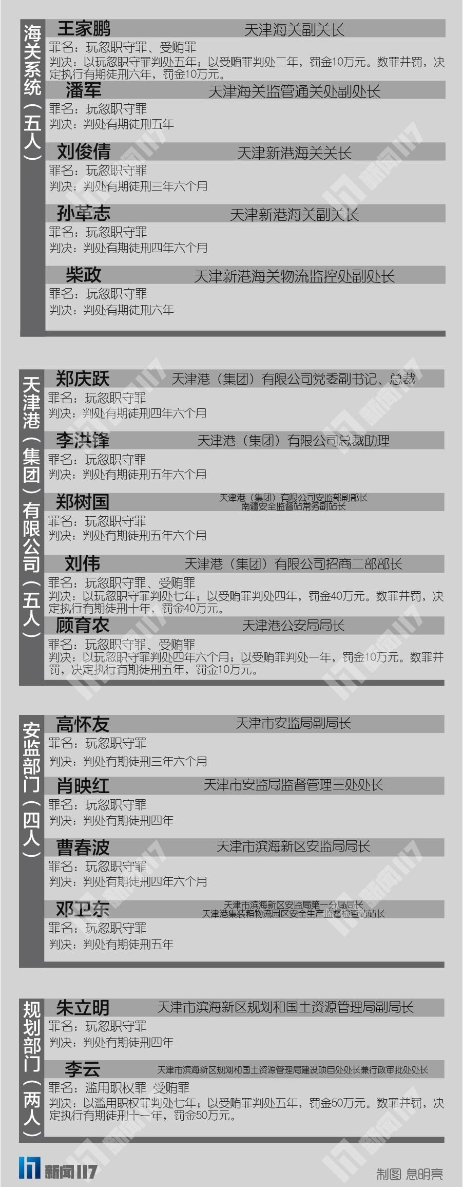 瑞海公司其他10名人員,也被判處三年至十八年不等的有期徒刑。