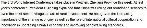 第三屆世界互聯(lián)網(wǎng)大會將于本周在浙江烏鎮(zhèn)舉行。在去年的大會上,中國國家主席習(xí)近平表示,中國將在偏遠(yuǎn)山村普及網(wǎng)絡(luò)寬帶,促進(jìn)農(nóng)村地區(qū)發(fā)展。他肯定了共享經(jīng)濟(jì)的重要性,以及國際文化合作和創(chuàng)新在中國經(jīng)濟(jì)升級和改善民眾生活中所扮演的角色。
