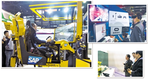▲ “互聯(lián)網(wǎng)之光”博覽會上,觀眾正在體驗(yàn)SAP的智能運(yùn)輸解決方案,特殊的T恤衫上裝有人體傳感器,能夠記錄司機(jī)的生理數(shù)據(jù)和駕駛動作。