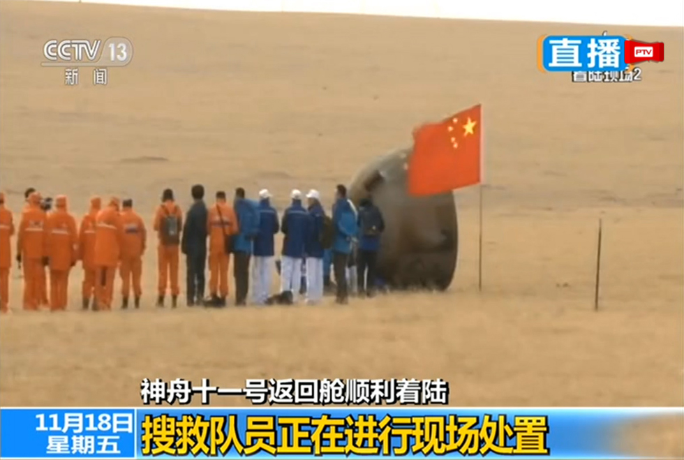 國際在線綜合報道:2016年11月18日,搭載航天員景海鵬、陳冬的神舟十一號飛船在完成各項任務(wù)后,順利在位于內(nèi)蒙古中部草原的主著陸場著陸。