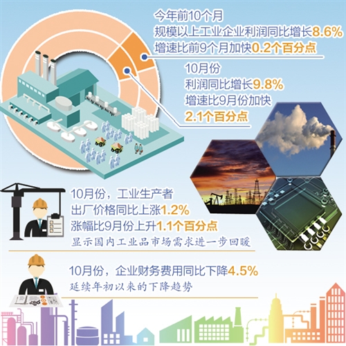 數(shù)據(jù)顯示,今年前10個月,規(guī)模以上工業(yè)企業(yè)利潤同比增長8.6%,增速比前9個月加快0.2個百分點。其中,10月份利潤同比增長9.8%,增速比9月份加快2.1個百分點。