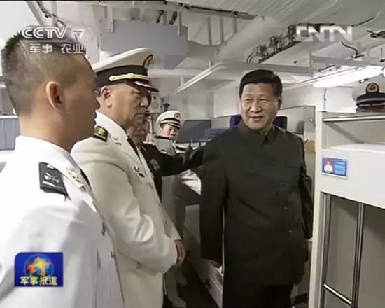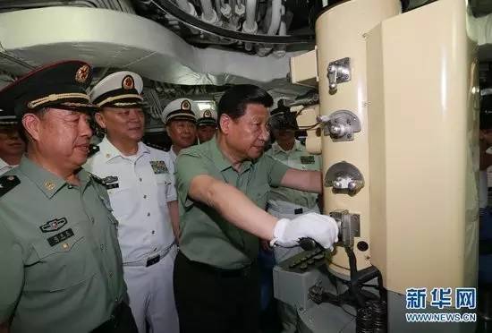 習(xí)主席先后視察了井岡山艦和某新型潛艇。檢閱結(jié)束后,他攀舷梯、下艙室、上甲板、進艦載直升機機艙,了解武器裝備性能,詢問官兵訓(xùn)練生活情況,接受水兵們贈送的艦帽、艦徽,并在航泊日志上簽名。