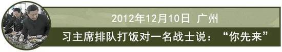 習(xí)近平在戰(zhàn)士食堂和士兵一起就餐。前面一名戰(zhàn)士見習(xí)主席過來,連忙禮讓,習(xí)主席笑著說:“你先來!你先來!”