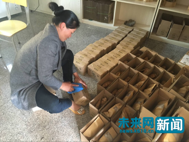 村民正在打包包裹。據(jù)她介紹,每天這樣的包裹要打包幾百個!霸僖膊粨(dān)心賣不出去了!”村民開心的說到。未來網(wǎng)記者 吳意茹攝。