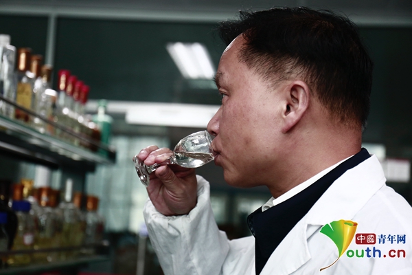 每天,童國(guó)強(qiáng)要端起酒杯,對(duì)酒進(jìn)行反復(fù)的品評(píng)、完善。中國(guó)青年網(wǎng)記者 劉尚君攝