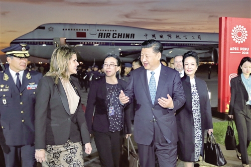 秘魯副總統(tǒng)阿勞斯到機(jī)場(chǎng)迎接習(xí)近平和夫人彭麗媛