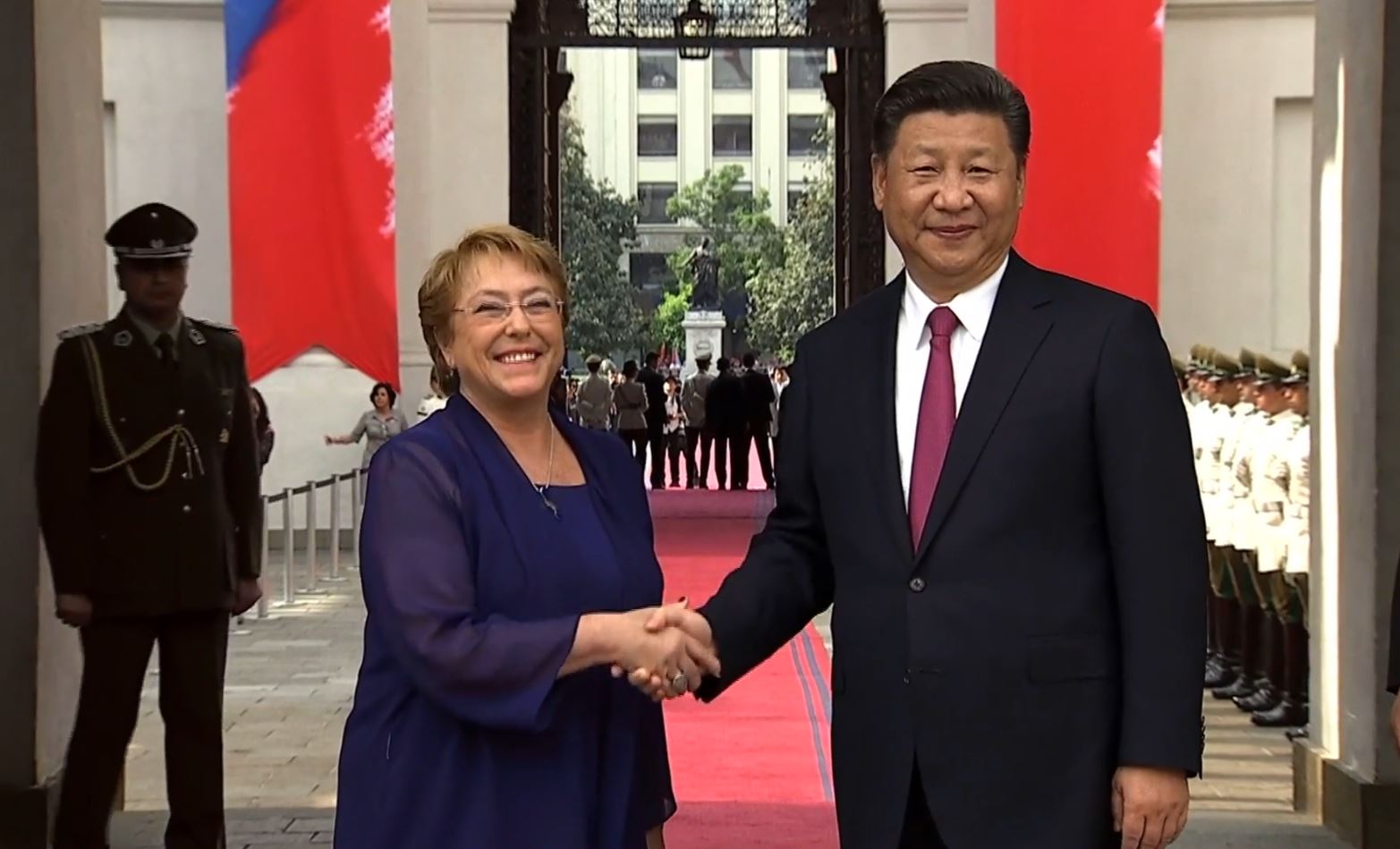 當(dāng)?shù)貢r(shí)間11月22日16:30 習(xí)近平出席智利總統(tǒng)巴切萊特舉行的歡迎儀式