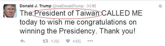 特朗普在美東時間2日下午16時44分在推特(Twitter)上發(fā)文,他說:“‘臺灣總統(tǒng)’今天打電話給我,祝賀我當(dāng)選,謝謝你!(The President of Taiwan CALLED ME today to wish me congratulations on winning the Presidency。 Thank you!)