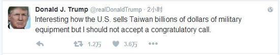 蔡英文與美國當(dāng)選總統(tǒng)特朗普星期五通電話,喜歡在網(wǎng)上發(fā)言的特朗普隨后發(fā)推文說:“臺灣總統(tǒng)今天打電話給我,祝賀我當(dāng)選,謝謝你!”之后他又發(fā)了一條推文:“美國賣給臺灣數(shù)十億美元的武器,我卻不應(yīng)該接個恭賀電話,真有趣!
