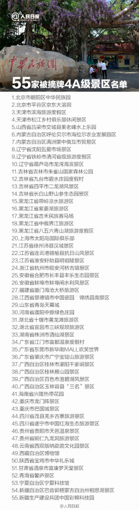 人民日?qǐng)?bào)記者王珂消息,國(guó)家旅游局今日通報(bào),截至目前,全國(guó)31個(gè)省區(qū)市均已完成對(duì)本地4A級(jí)及以下景區(qū)檢查,共有367家4A級(jí)及以下景區(qū)受到不同程度處理。其中,107家A級(jí)景區(qū)被摘牌,包括55家4A級(jí)景區(qū),黑龍江5家、吉林、廣西各4家、遼寧、江蘇、廣東各3家。