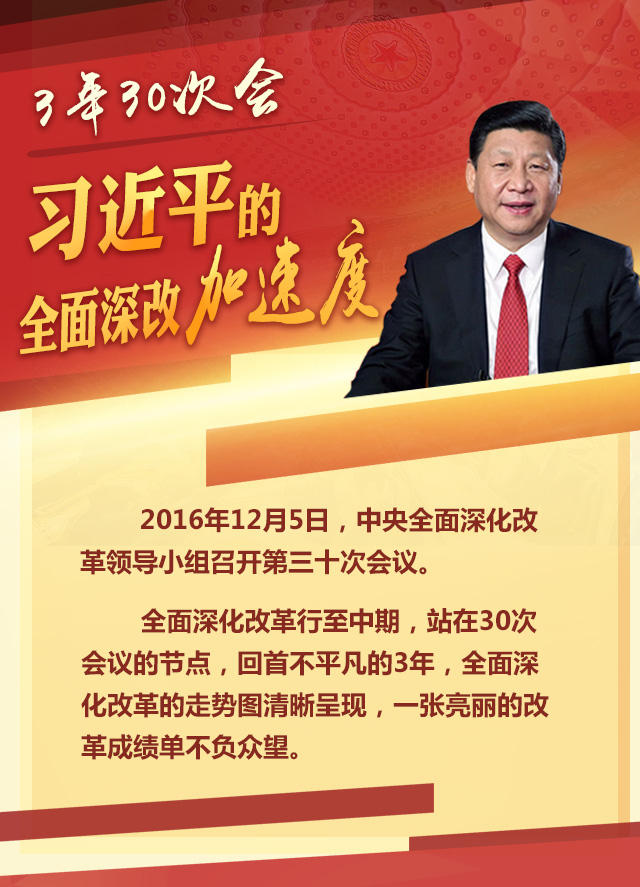 2016年12月5日,中央全面深化改革領(lǐng)導(dǎo)小組召開(kāi)第三十次會(huì)議。全面深化改革啟動(dòng)3年來(lái),在習(xí)近平總書(shū)記直接領(lǐng)導(dǎo)下,中央深改組的30次會(huì)議,牢牢把握改革正確方向,及時(shí)提出階段性任務(wù)目標(biāo),著眼全局性重大問(wèn)題進(jìn)行頂層設(shè)計(jì),審議通過(guò)198份改革文件,狠抓改革舉措落地,直面問(wèn)題點(diǎn)穴開(kāi)方……