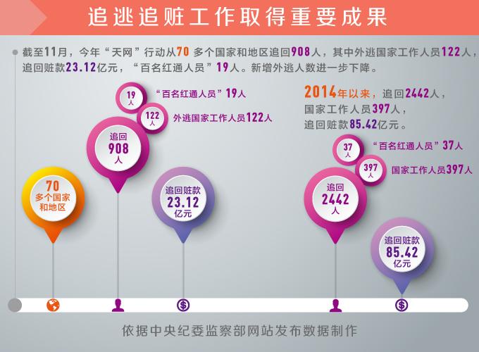 “截至11月,今年‘天網(wǎng)’行動共從70多個國家和地區(qū)追回908人,其中外逃國家工作人員122人,追回贓款23.12億元,‘百名紅通人員’19人!12月9日,第13個“國際反腐敗日”到來之際,國家預防腐敗局副局長、中央紀委國際合作局局長劉建超接受采訪時表示,“中國正在以自身追逃追贓的實踐引領國際反腐敗執(zhí)法合作!