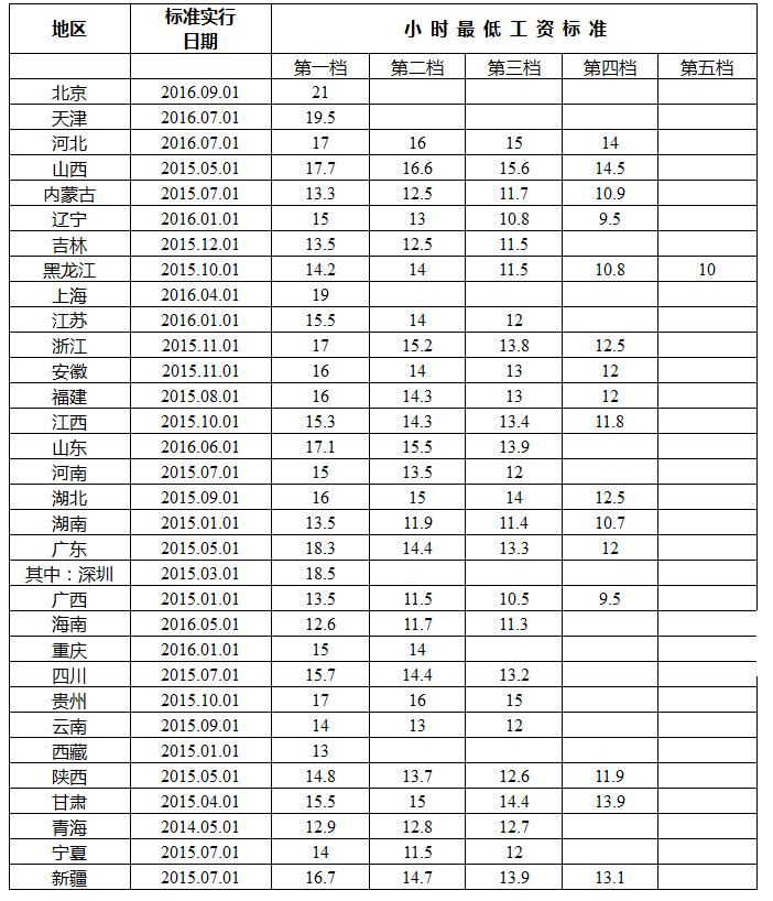 中新網(wǎng)12月13日電 據(jù)人社部網(wǎng)站消息,截止2016年12月,全國(guó)各地區(qū)月最低工資第一檔中上海最高,為2190元,青海最低,1270元;小時(shí)最低工資第一檔中北京最高,為21元,海南最低,為12.6元。