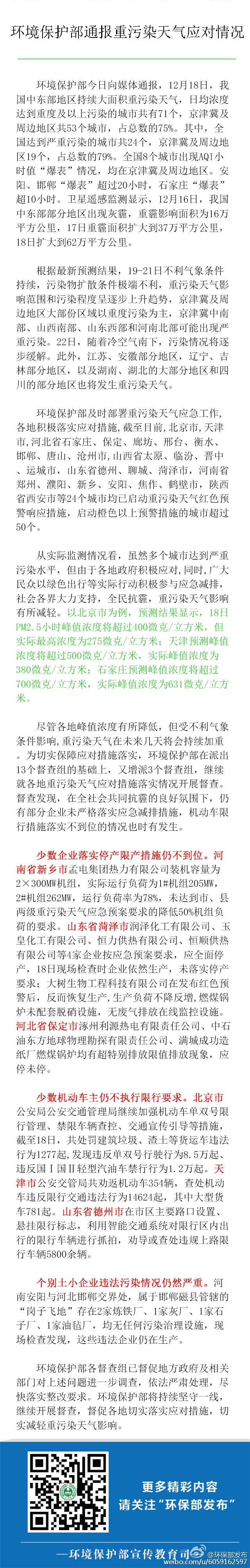 據(jù)環(huán)境保護(hù)部宣傳教育司官方微博消息,環(huán)保部今日向媒體通報(bào),12月18日,中國(guó)中東部地區(qū)持續(xù)大面積重污染天氣,日均濃度達(dá)到重度及以上污染的城市共有71個(gè),京津冀及周邊城市地區(qū)共53個(gè)城市,占總數(shù)的75%。