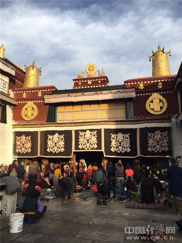 大昭寺前跪拜的信眾。 中國經(jīng)濟網(wǎng)記者李婧 攝。