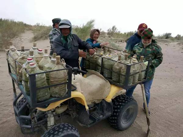 萬事開頭難!由于古日乃地區(qū)嚴(yán)重缺水,常年處于干旱狀態(tài),剛開始,老倆口種的樹成活率不高。可是,面對(duì)低成活率和惡劣的環(huán)境,固執(zhí)的圖布巴圖沒有動(dòng)搖,而是買了相關(guān)書籍,從書里找答案,向林業(yè)等相關(guān)部門專業(yè)技術(shù)人員求教!在樹種選擇上下功夫,從“源頭”開始提高造林成活率。經(jīng)過與專業(yè)人員探討,他們挑選適宜本地區(qū)種植的耐旱、耐鹽堿的梭梭等優(yōu)良草科植物。因地制宜、因時(shí)搶栽。春天風(fēng)大,夫妻倆把梭梭苗泡在水里,等風(fēng)勢(shì)減弱時(shí),搶時(shí)間栽種,像是跟老天爺玩捉迷藏,常常累得喘不過氣來!夏天是梭梭苗補(bǔ)水的季節(jié),沙漠中的氣溫高達(dá)45℃以上,夫妻倆頂著似火驕陽一趟趟拉水澆灌。45℃的高溫下,普通人坐著都覺得難忍,何況是60多歲的老人,還要在烈日下勞作!那種艱難是我們無法想象的……