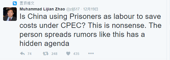 《黎明報》稱,趙立堅在推特上還駁斥那些稱中巴經(jīng)濟走廊存在腐敗的指責:“送他們一句中國諺語:以小人之心度君子之腹”。他還在智庫研討會上表示,“中巴經(jīng)濟走廊全都是納稅人的錢,這些是投資項目。我們不會允許腐敗或賄賂行為”。趙立堅說,在決定中巴經(jīng)濟走廊的相關(guān)項目時,會有透明的投標程序,一切信息將隨時公開。