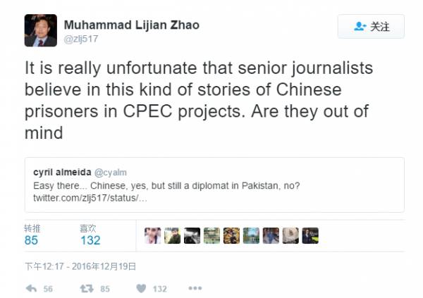 趙立堅20日在推特上與巴《黎明報》記者阿爾梅達之間的“公開論戰(zhàn)”吸引了大量媒體關(guān)注。印度電視臺稱,針對有傳言說“中國用囚犯當勞力,以節(jié)省中巴經(jīng)濟走廊的經(jīng)費”,趙立堅稱“荒唐至極,傳播這種謠言的人有不可告人的目的”。他還表示,居然有資深記者相信這樣的謠言,“他們瘋了嗎”?對此,阿爾梅達在推特上回應稱,“不可否認這里有令人遺憾的瘋子,但這肯定不是理性(或外交性)的回應”,“以這樣的方式在這里(工作),不久你就要長動脈瘤了……”趙立堅反嗆說:“造謠中巴經(jīng)濟走廊使用中國囚犯的人,他們夠理性(外交性)嗎?對于那些人,我只有一個詞:荒唐!