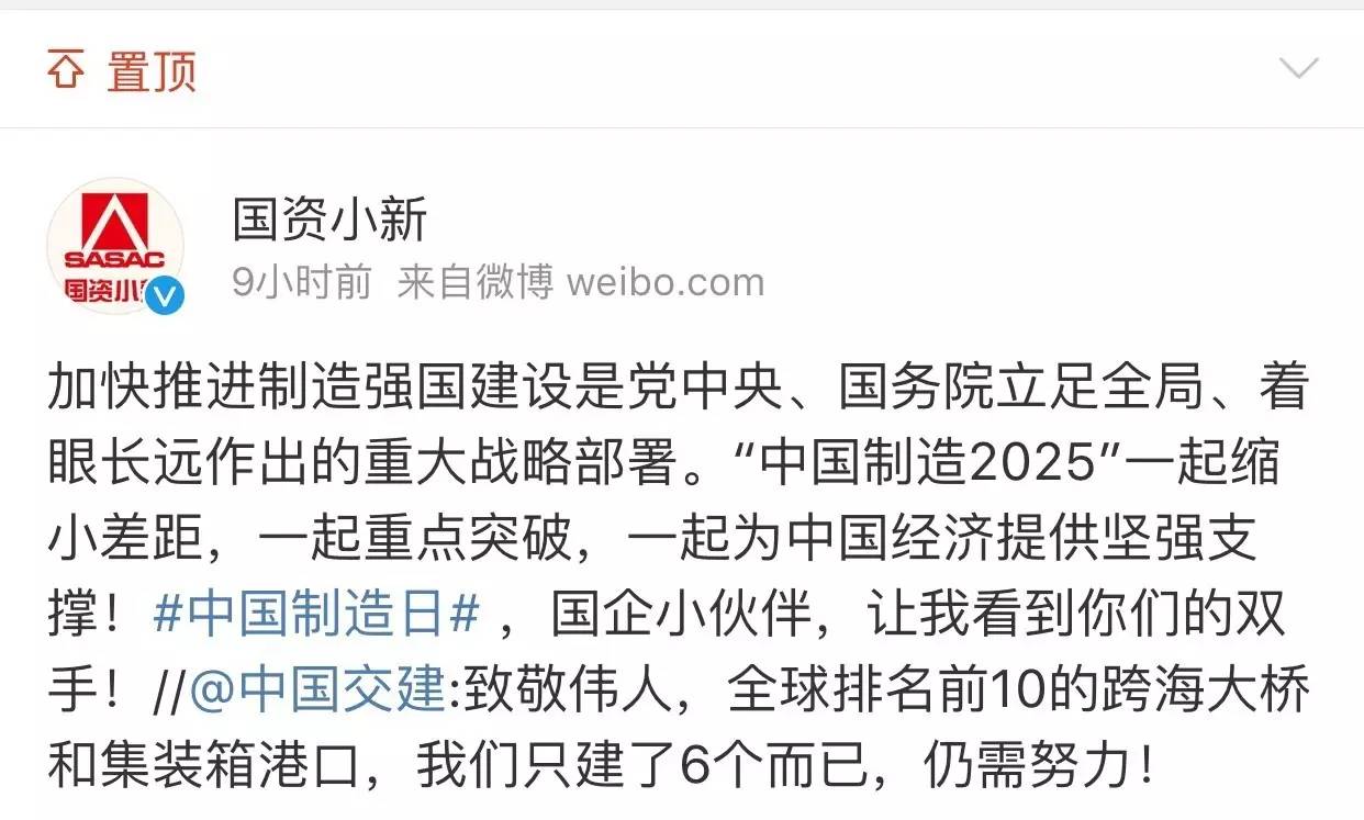 剛剛結(jié)束的推進(jìn)“中國(guó)制造2025”工作會(huì)暨國(guó)家制造強(qiáng)國(guó)建設(shè)領(lǐng)導(dǎo)小組第四次會(huì)議上指出,加快推進(jìn)制造強(qiáng)國(guó)建設(shè)是黨中央、國(guó)務(wù)院立足全局、著眼長(zhǎng)遠(yuǎn)做出的重大戰(zhàn)略部署。在毛澤東同志誕辰123周年的今天,@共青團(tuán)中央 和@國(guó)資小新 共同發(fā)起#中國(guó)制造日#話題。集中展示國(guó)有企業(yè)和中國(guó)制造所取得的巨大進(jìn)步,為全面實(shí)施“中國(guó)制造2025”,深化創(chuàng)新驅(qū)動(dòng)貢獻(xiàn)力量。讓我們共同努力,一起縮小差距,一起重點(diǎn)突破,一起為中國(guó)經(jīng)濟(jì)提供堅(jiān)強(qiáng)支撐!