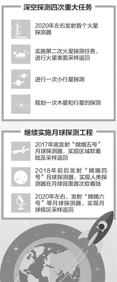 此外,我國還將繼續(xù)實施月球探測工程,突破探測器地外天體自動采樣返回技術。將在2017年底發(fā)射“嫦娥五號”月球探測器,實現區(qū)域軟著陸及采樣返回,全面實現月球探測工程“三步走”戰(zhàn)略目標;2018年前后發(fā)射“嫦娥四號”月球探測器,實現人類探測器在月球背面首次軟著陸,開展原位和巡視探測,以及地月L2點中繼通信;還將于2020年左右,發(fā)射“嫦娥六號”等月球探測器,實現月球極區(qū)采樣返回。