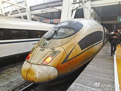4日,有網(wǎng)友稱從徐州發(fā)往北京的高鐵,在到達(dá)目的地后車身變成了“金色”。該網(wǎng)友向北青報記者描述道,“像是霧霾,整個車身非常臟,但也不排除是因為天氣不好所以減少了列車清洗次數(shù)!