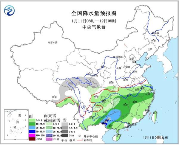 今天,南方雨雪繼續(xù),也是此輪降水最為強盛的一天。中央氣象臺預計,11日08時至12日08時,四川西北部、湖北西部、湖南西北部、貴州中部和東北部等地有小雪或雨夾雪,局地中雪;西南地區(qū)東部、江漢、江淮、江南、華南等地有小到中雨,其中,廣西西部和北部、貴州東南部、湖南西南部等地有大雨,局地暴雨。