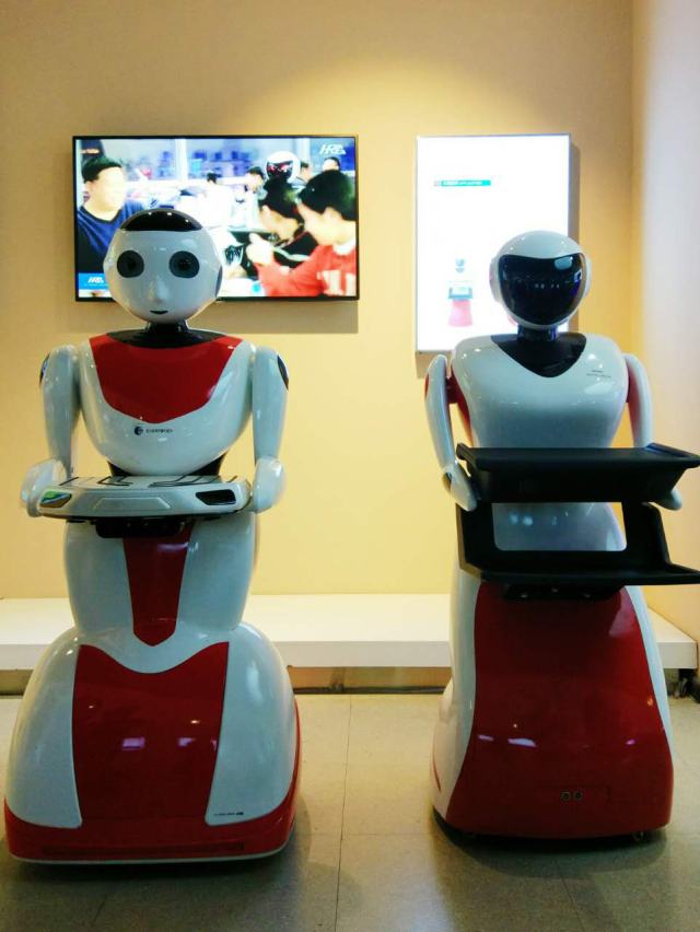 這兩款是餐飲機(jī)器人,外形小巧圓潤,笑容憨態(tài)可掬,既可以點菜和送餐,還具有重力感應(yīng)、自動避障、語音對話等功能。在餐廳遇到這樣的服務(wù)員,一定是場新奇的用餐體驗。