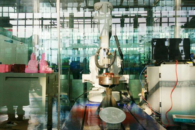 這是雕刻機(jī)器人,能夠?qū)浗饘倩蜍洸牧线M(jìn)行高速鉆削和雕刻,還可以根據(jù)三維模型自動生成加工軌跡,比人工更加精準(zhǔn)。