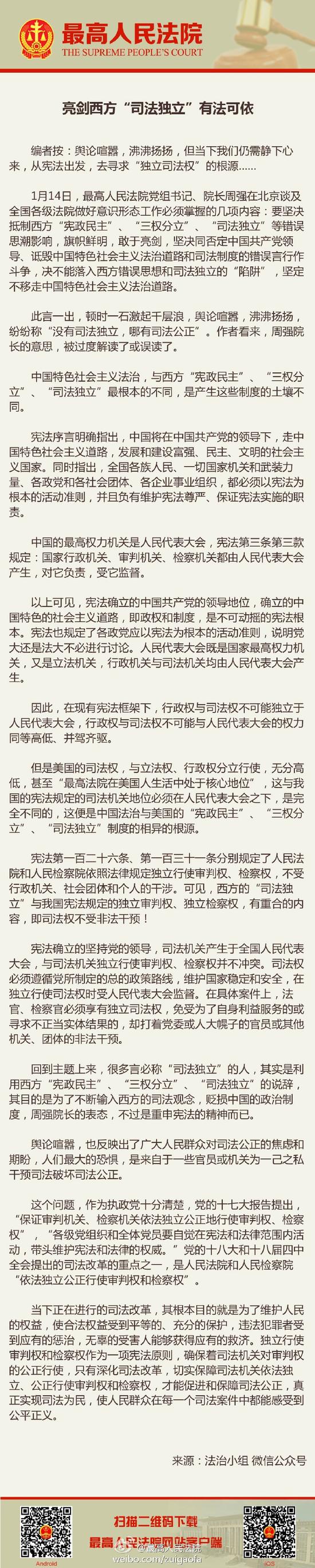 [亮劍西方“司法獨立”有法可依]獨立行使審判權(quán)和檢察權(quán)作為一項憲法原則,確保著司法機關(guān)對審判權(quán)的公正行使,只有深化司法改革,切實保障司法機關(guān)依法獨立、公正行使審判權(quán)和檢察權(quán),才能促進和保障司法公正,真正實現(xiàn)司法為民,使人民群眾在每一個司法案件中都能感受到公平正義。