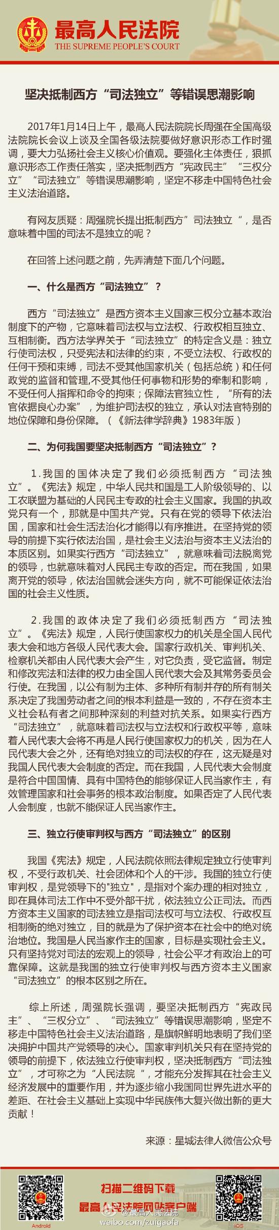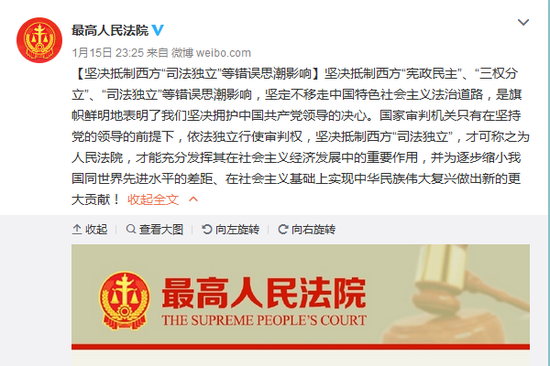 [堅決抵制西方“司法獨立”等錯誤思潮影響]堅決抵制西方“憲政民主”、“三權(quán)分立”、“司法獨立”等錯誤思潮影響,堅定不移走中國特色社會主義法治道路,是旗幟鮮明地表明了我們堅決擁護中國共產(chǎn)黨領(lǐng)導的決心。國家審判機關(guān)只有在堅持黨的領(lǐng)導的前提下,依法獨立行使審判權(quán),堅決抵制西方“司法獨立”,才可稱之為人民法院,才能充分發(fā)揮其在社會主義經(jīng)濟發(fā)展中的重要作用,并為逐步縮小我國同世界先進水平的差距、在社會主義基礎(chǔ)上實現(xiàn)中華民族偉大復興做出新的更大貢獻!