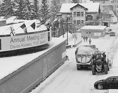 2017年達(dá)沃斯論壇在即,圖為工人們正在清掃論壇會(huì)場(chǎng)附近的積雪。劉軍攝/光明圖片