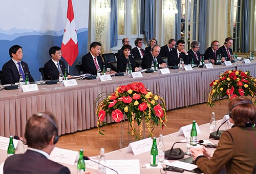 中新社伯爾尼1月16日電 (記者 蔣濤)中國國家主席習(xí)近平16日在伯爾尼同瑞士聯(lián)邦主席洛伊特哈德共同會見瑞士經(jīng)濟(jì)界代表。