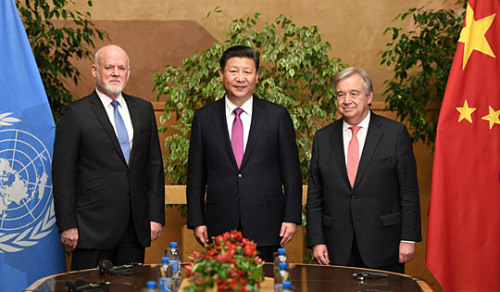 中新社日內(nèi)瓦1月18日電 (記者 蔣濤)中國(guó)國(guó)家主席習(xí)近平18日在日內(nèi)瓦萬國(guó)宮會(huì)見第71屆聯(lián)合國(guó)大會(huì)主席湯姆森和聯(lián)合國(guó)秘書長(zhǎng)古特雷斯,強(qiáng)調(diào)中國(guó)堅(jiān)定走多邊主義道路,捍衛(wèi)聯(lián)合國(guó)憲章宗旨和原則,支持聯(lián)合國(guó)為維護(hù)世界和平、促進(jìn)共同發(fā)展發(fā)揮更大作用。