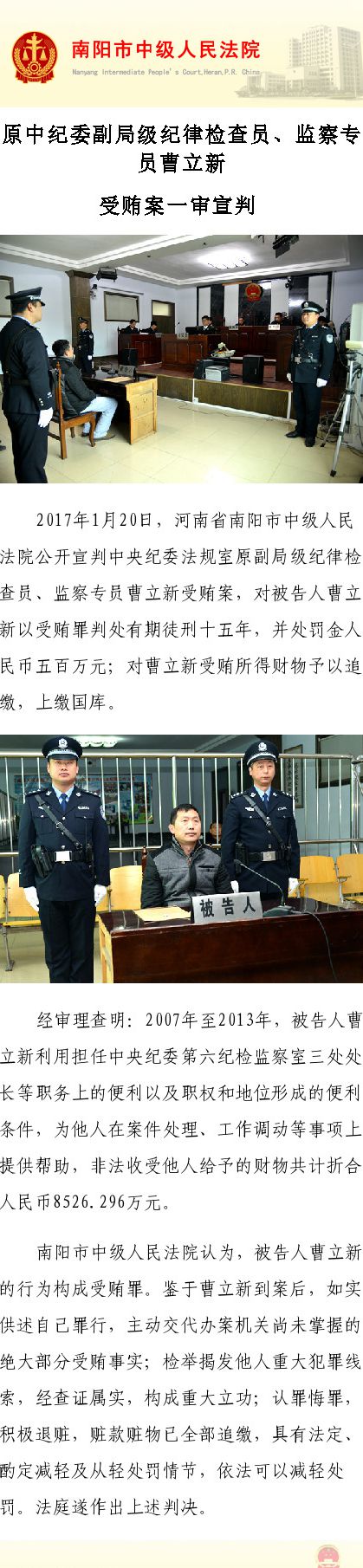 據(jù)南陽市中級人民法院官方微博消息,2017年1月20日,河南省南陽市中級人民法院公開宣判中央紀(jì)委法規(guī)室原副局級紀(jì)律檢查員、監(jiān)察專員曹立新受賄案,對被告人曹立新以受賄罪判處有期徒刑十五年,并處罰金人民幣五百萬元;對曹立新受賄所得財物予以追繳,上繳國庫。