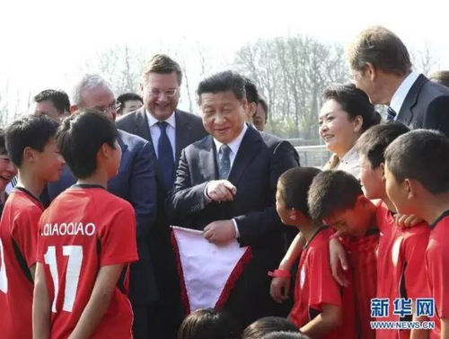 2014年3月,習(xí)近平看望在德國(guó)訓(xùn)練的來(lái)自陜西志丹縣的中國(guó)少年足球運(yùn)動(dòng)員。