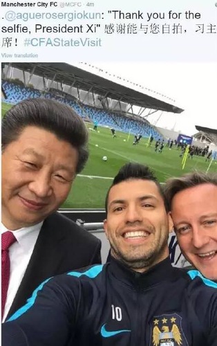 2015年10月,習(xí)近平訪問(wèn)英超曼城俱樂(lè)部,同卡梅倫首相、曼城球星阿圭羅一起自拍。