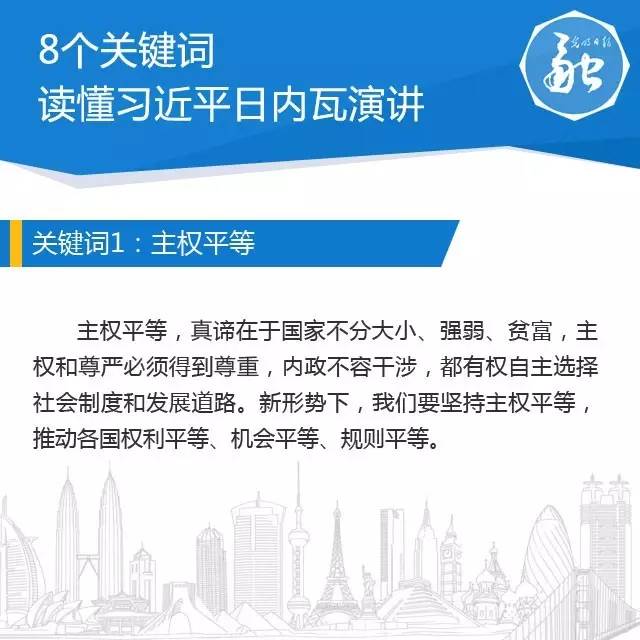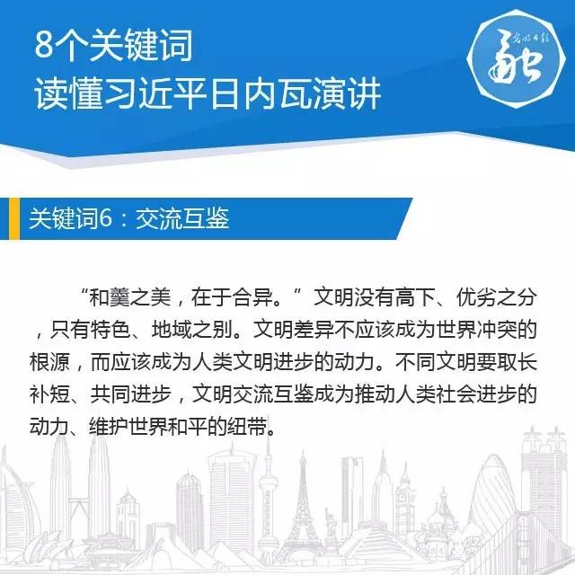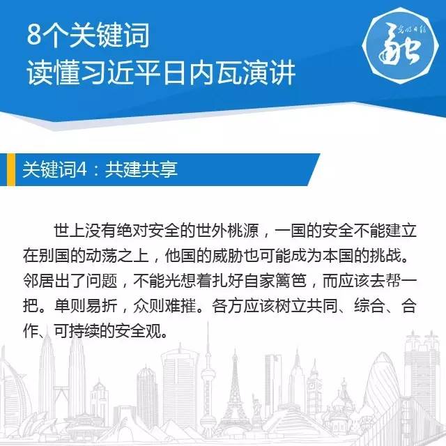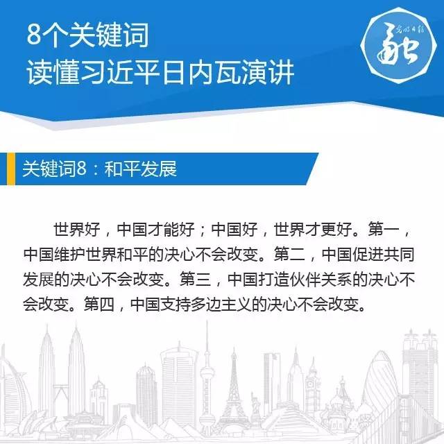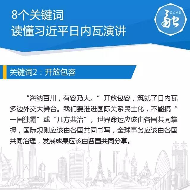 1月18日,國家主席習近平在瑞士日內瓦萬國宮出席“共商共筑人類命運共同體”高級別會議,并發(fā)表題為《共同構建人類命運共同體》的主旨演講。習近平在演講中提到:“對中國來講,日內瓦具有一份特殊的記憶和情感。1954年,周恩來總理率團出席日內瓦會議,同蘇聯(lián)、美國、英國、法國等共同討論政治解決朝鮮問題和印度支那停戰(zhàn)問題,展現(xiàn)和平精神,為世界和平貢獻了中國智慧!苯裉,小編帶你用8個關鍵詞,讀懂習近平日內瓦演講。