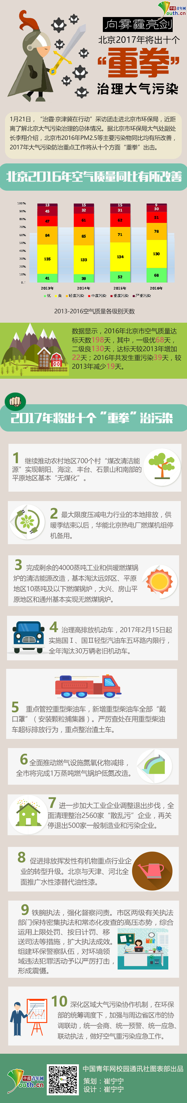 中國青年網(wǎng)1月24日電(記者 崔寧寧)“治霾·京津冀在行動”采訪團走進北京環(huán)保局,近距離了解北京大氣污染治理的總體情況。據(jù)北京市環(huán)保局大氣處副處長李翔介紹,北京市2016年P(guān)M2.5等主要污染物同比均有所改善,2017年大氣污染防治重點工作將從十個方面“重拳”出擊。