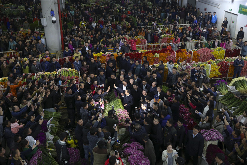 【總理夜訪昆明花市:關(guān)心起早貪黑的花農(nóng)】春節(jié)將至,昆明斗南花卉市場內(nèi)鮮花匯成七彩海洋。24日晚,總理意外到訪,讓這個人頭攢動的市場沸騰了。李克強(qiáng)仔細(xì)詢問鮮花品種價格,關(guān)心花農(nóng)收入,還自掏腰包買了兩束花?偫碚f:“你們起早貪黑、辛苦勞作,給全國人民送去歡樂吉祥。我祝福你們春節(jié)快樂!”