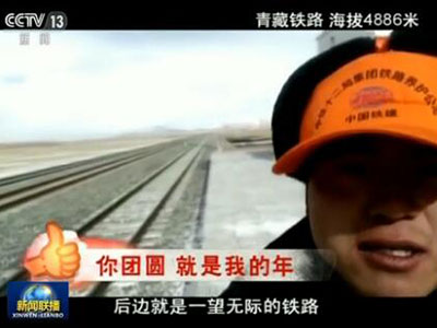 這個海拔,你看,4886米,后邊就是一望無際的鐵路,像條巨龍一樣盤在高原上。雖然這兒的條件艱苦,每天的氣溫零下二三十度,但是我熱愛我這份工作。每次工作閑余之時,想家的時候,我就盼望著火車過來,看見火車過來就像看見我的親人一樣,感覺特別地親切。雖然每年(過年)都回不了家,但是我讓更多的人能回家過年,我感到特別地高興。