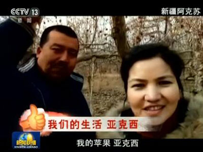 大家新年好,我在新疆阿克蘇,我來看看合作伙伴買買提大叔。這是買買提大叔的蘋果園,買買提大叔的蘋果又香又甜。前些年大叔一直發(fā)愁,自己的蘋果賣不出去。去年我一畢業(yè)回阿克蘇辦起了網店,去年買買提大叔修了新房,我買了新車。買買提大叔的蘋果通過互聯(lián)網賣到了全國各地。厲害了,我的國!我的蘋果,亞克西!我的國,亞克西!