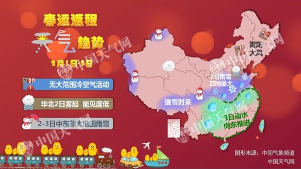 原標題:春節(jié)返程雨雪霧同行 大部地區(qū)氣溫回暖
