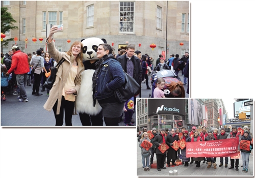 下圖 近年來,中國春節(jié)正被越來越多的美國民眾接受,多地舉辦系列活動(dòng)慶祝這一傳統(tǒng)節(jié)日。圖為中美兩國藝術(shù)家在紐約時(shí)代廣場共同展示中國“!弊帧 經(jīng)濟(jì)日報(bào)記者 朱 旌攝