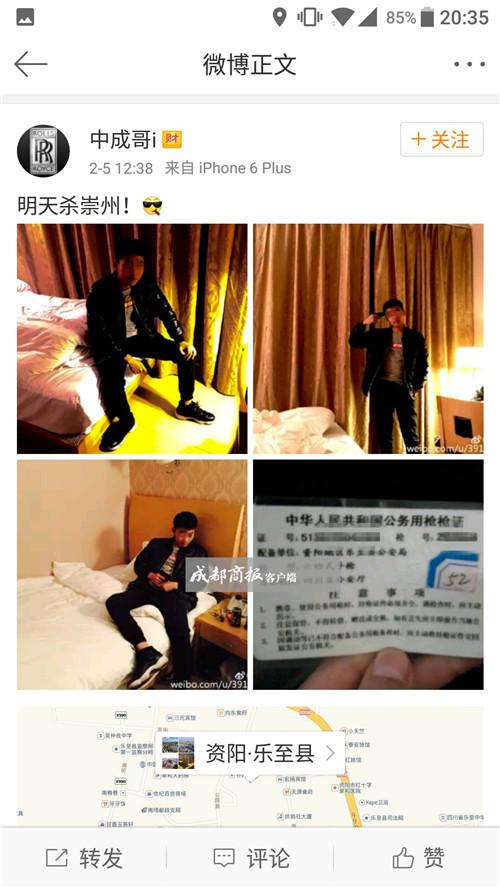 6日,該微博已被發(fā)布者“中成哥i”刪除。但根據(jù)報料者截圖,“明天殺崇州!”的微博發(fā)布于2月5日12時38分,微博發(fā)布時的定位為資陽市樂至縣公園路附近。4張配圖中,有3張同一小伙在賓館內(nèi)持槍的圖片,另有1張圖片為“中華人民共和國公務(wù)用槍槍證”,上面能清晰地看出證號、槍號、配備單位、槍型和發(fā)證機關(guān)。“中華人民共和國公務(wù)用槍槍證”顯示,槍支配備單位為資陽地區(qū)樂至縣公安局,槍型為六四式手槍,發(fā)證機關(guān)為四川省公安廳。