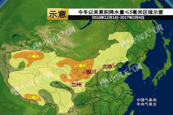 2016年12月以來,北方地區(qū)的內蒙古、華北北部、西北等地普遍“貧雪”。據統(tǒng)計,截至今年2月4日上述地區(qū)累積降水量普遍不足5毫米,特別是內蒙古西部、寧夏中北部、甘肅中部等地,累積降水量甚至不足1毫米。此輪降水雖然強度不大,但可算得上“久旱逢甘霖”了。